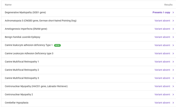 Ten raport zawiera listę cech fizycznych i behawioralnych zakodowanych w DNA Twojego zwierzaka. Każda wykryta cecha jest opatrzona jasnym opisem, np. „małe prawdopodobieństwo” lub „nie występuje” itp.