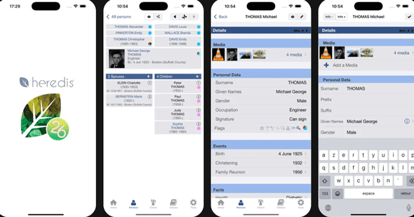 Z mobilnej wersji Heredis można korzystać bez konieczności instalowania oprogramowania na komputerze. Możesz tworzyć drzewa genealogiczne z nieograniczoną liczbą osób w formacie PDF do wydruku lub importować pliki GEDCOM. Intuicyjny interfejs prowadzi Cię od stworzenia pierwszego przodka do ustrukturyzowania drzewa z dużą elastycznością.