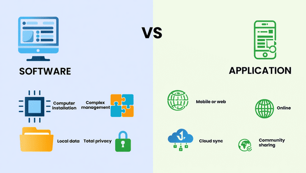 Z kolei aplikacja to wersja mobilna (smartfon lub tablet) lub interfejs internetowy powiązany z internetową stroną genealogiczną. Lżejsza i bardziej intuicyjna, koncentruje się na synchronizacji w czasie rzeczywistym, dostępie mobilnym i udostępnianiu społeczności.
